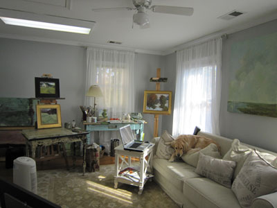 Many of our artists also have adoring pets. Since Bethanne Cople lives around the corner, she often visits with her beautiful Golden Retriever, Winnie. Here’s Winnie, the critic, in Bethanne’s studio: