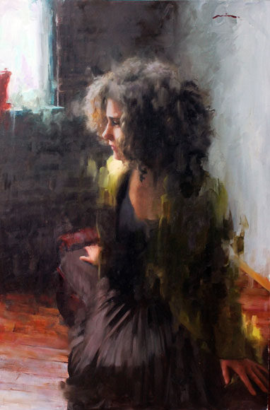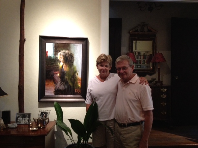 We always love to see artwork go to a good home! It’s even better when the artist gets to meet collectors and see them enjoying the piece! We recently sold a piece by Mia Bergeron, which Mia kindly delivered to her collectors and friends Tom & Pam. While she was there she took this great picture of them with her painting in its new home!