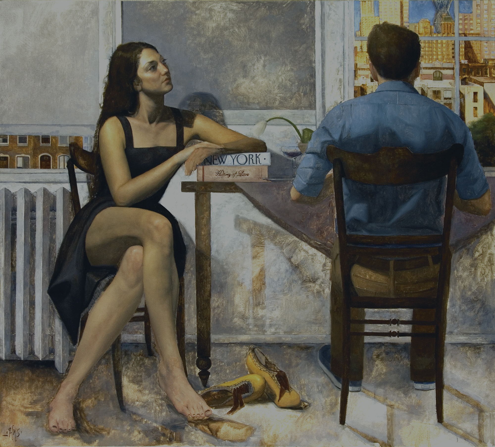 The views out the two windows represent Hyeseung’s transition between New York and Baltimore, as the scene outside the window to the left shows the view from her Baltimore studio, and the window on the right shows the view from her studio in New York. The couple shown is meant to represent herself and her husband, though while her husband modeled for the male figure, the woman shown is a model Hyeseung works with in Baltimore. Shown between these two “worlds,” the woman is posed with a thoughtful expression on her face. In an interview, Hyeseung explained that, “The painting is a lot about how we never know what’s going on in someone else’s head, even when that someone else is right in front of us: the ultimate privacy of the mind.” Fairly large in size, and somewhat quiet in color and mood, this work is an excellent representation of the careful thought with which Hyeseung creates her works.