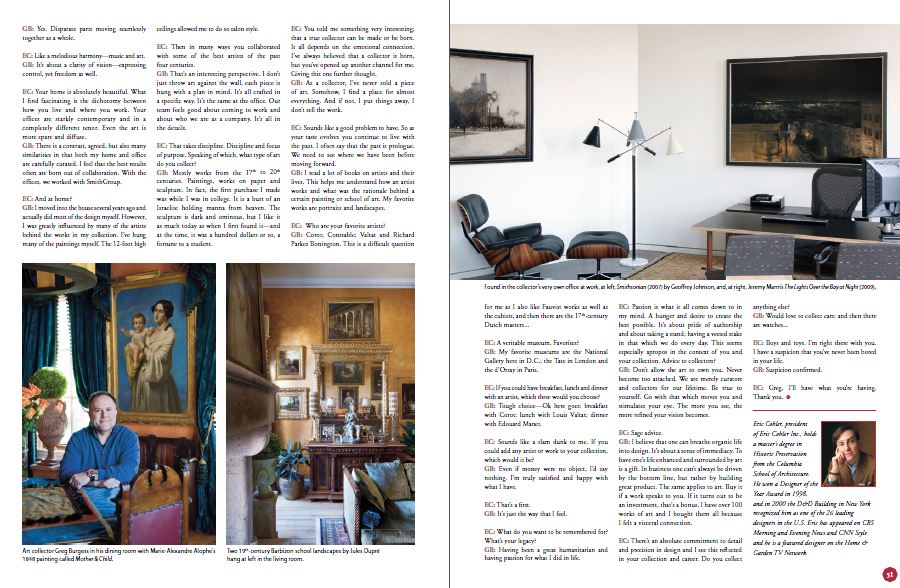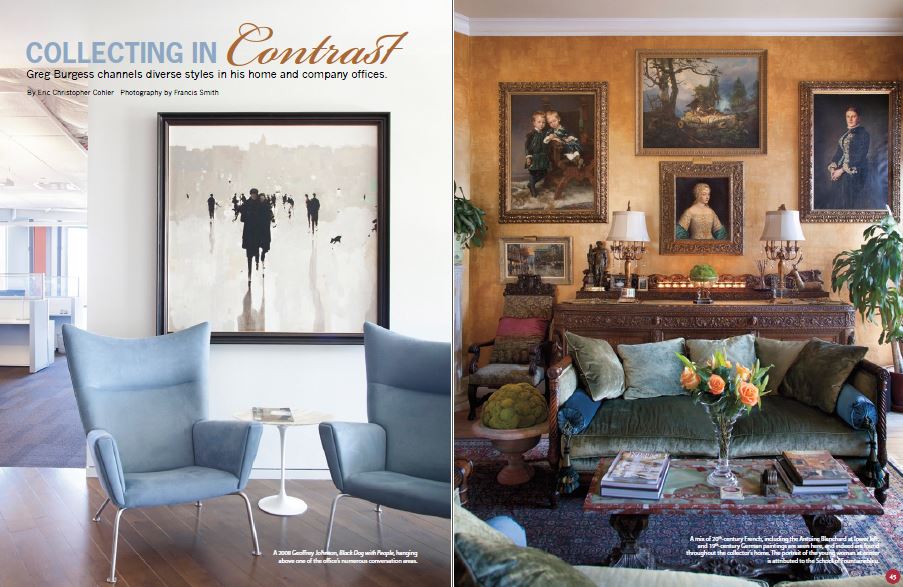 For those of us at the gallery, the last time we see a painting is usually when it is sent off to its new destination or picked up and taken away in the happy collector’s hands. Occasionally, though, we have the pleasure of seeing our artists’ work beautifully photographed “in situ,” or in place, in the new owners’ homes and offices. Today we’d like to share two spreads from past issues of American Art Collector which give a glimpse into the homes and offices of some of our most avid art collectors.