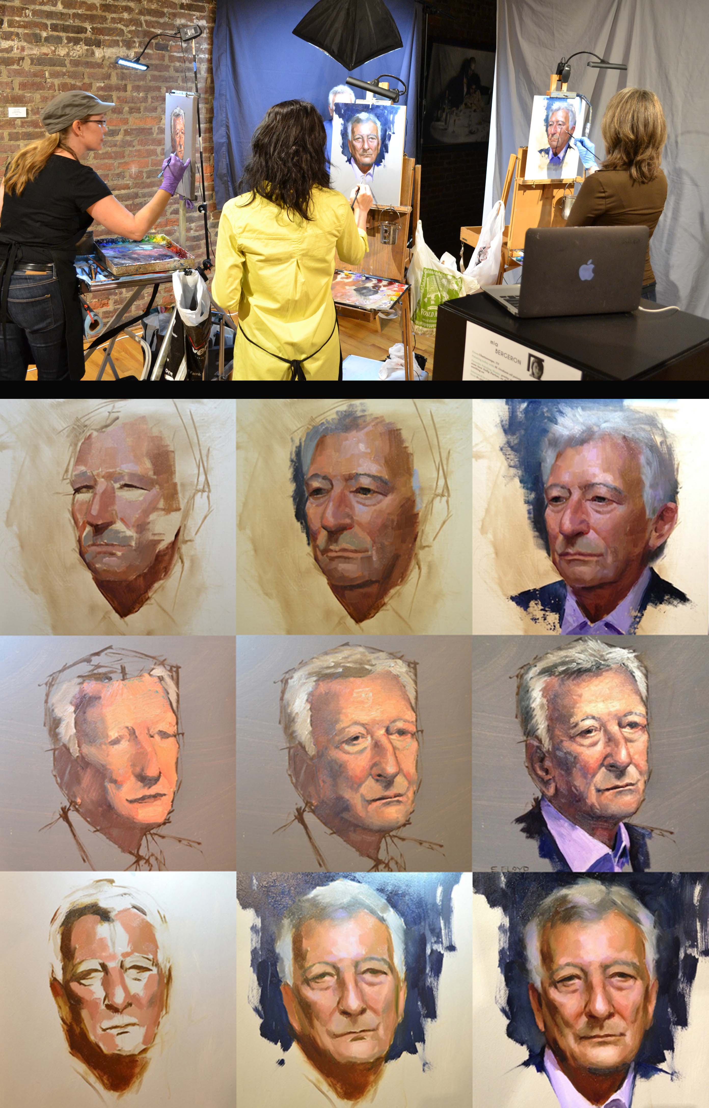 This year we held our third annual “Face Off” live painting event. Artists Cindy Procious, Mia Bergeron, and Elizabeth Floyd gathered in the gallery to simultaneously paint this year’s model, local restaurant owner Franco Landini. As a new twist for this year’s event, we also had three live streams of each artist as they created their portraits in just 3 hours! You can still see the footage as well as the time-lapse videos on our YouTube page.