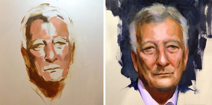 Several of our Technique Tuesday posts will discuss techniques relating to what is called “underpainting.” Underpainting refers to the initial layer of paint an artist applies to a canvas, usually in a manner that will help them roughly plan out the composition and the values (light and dark areas) in the work. Blocking in is a common and relatively simple method of underpainting that allows an artist to quickly sketch out the work by painting in simple “blocks,” or shapes, of color. The later layers of paint added will serve to refine the details, colors, and lights and shadows. Here’s a great example of this method, demonstrated by these two images from our Face Off event last August: