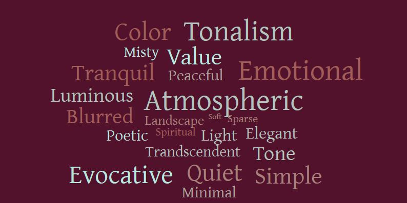 “Tonalism” is the name that was eventually given to the art movement popularized in the late 1800’s by American landscape painters. Essentially, Tonalism is a way of painting landscapes that is characterized by soft, blurred lines, gentle use of colors in the mid-range of tones and values, and an elegantly simple composition. For many Tonalist painters, the use of this style was inspired by the philosophers and Transcendentalist ideas popular in America at the time Tonalism began. By painting a landscape in this certain way, artists sought to transform the portrayal of a landscape into something that might elicit a spirit of contemplation and introspection from the viewer, turning it into a tranquil and meditative device. An early member of the Tonalist movement, Birge Harrison, once described the objective to his students as that of striving for the “big vision-the power to see and to render the whole of a given scene, rather than to paint a still-life picture of its component parts; the power to aint the atmosphere that surrounds the objects rather than the objects themselves; the power, in one word, to give the mood of a motive rather than the scientific statement of the trees and rocks and fields and mountains that make up the elements.” Tonalism took many varied forms in the work of different artists, but here’s a word cloud to help give you an idea of the common qualities of Tonalist paintings.