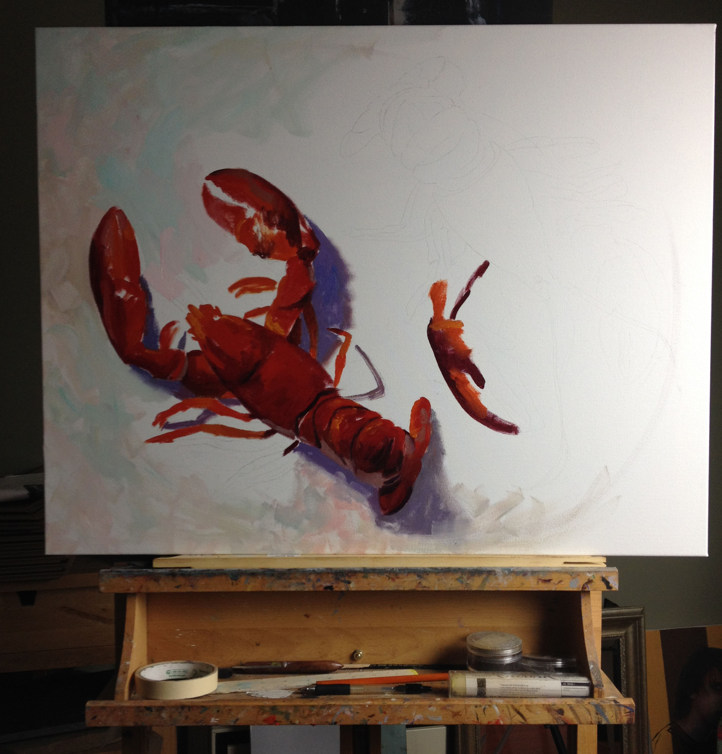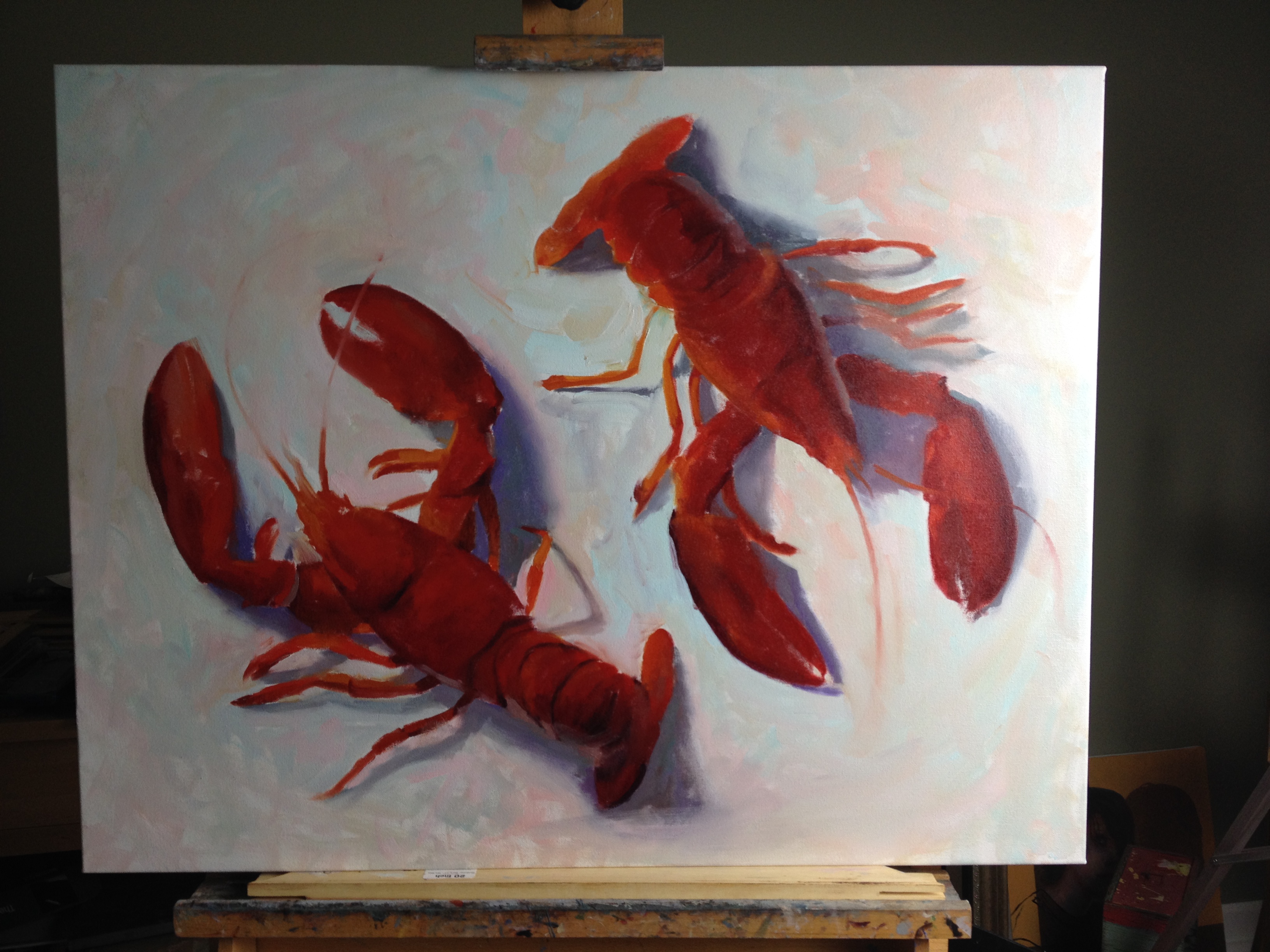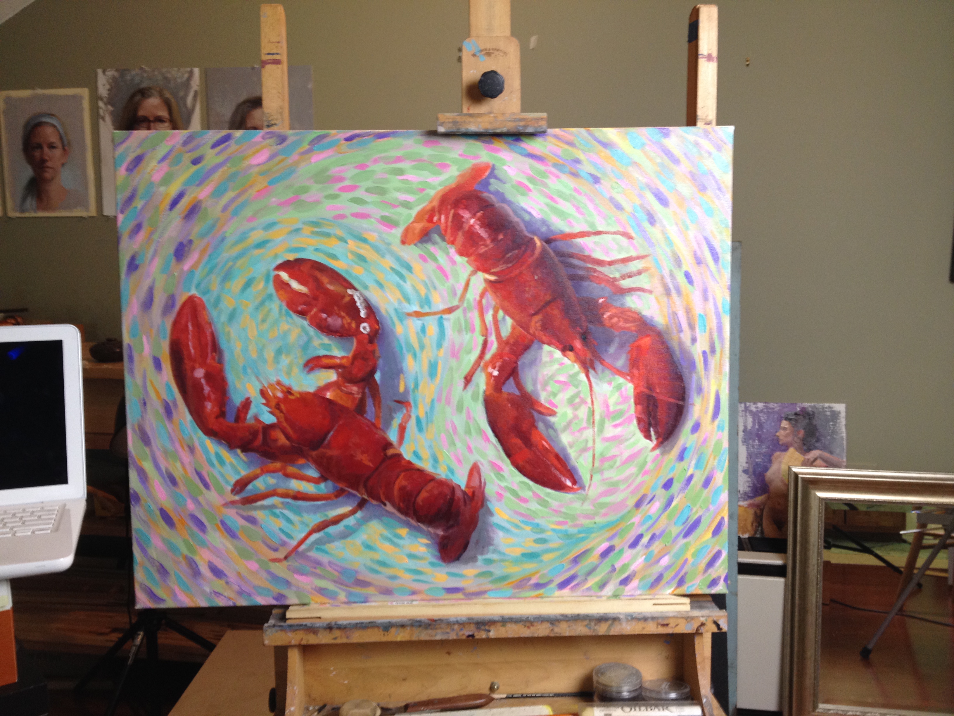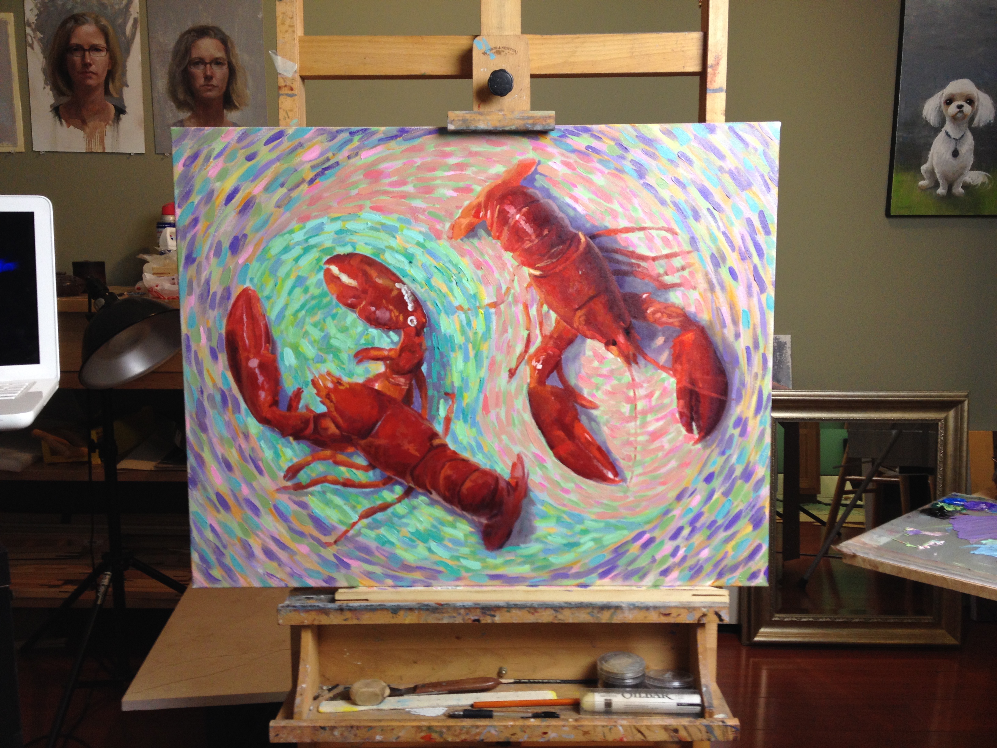 Remember last November, when Cindy Procious and Mia Bergeron had that fantastic two person exhibition with us? One of Cindy’s largest paintings in that show was “Yin and Yang in a Crustacean World”. Check out these in-progress photos Cindy took to see the awesome journey these two lobsters went on!