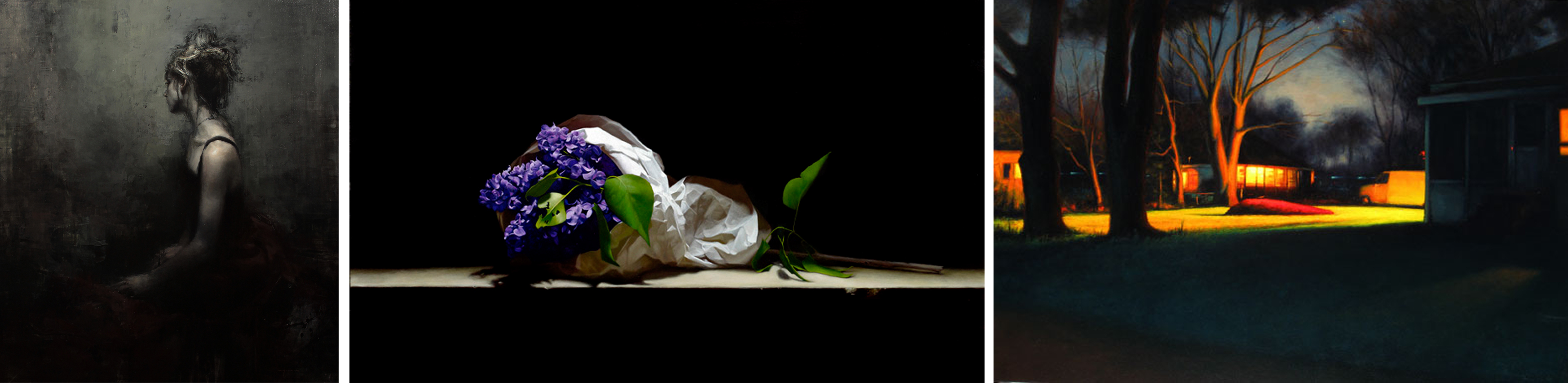 (left) Jeremy Mann, “The Melancholy Passerine”; (middle) Richard Murdock, “Wrapped Lilacs”; (right) Brian Martin, “Departure”