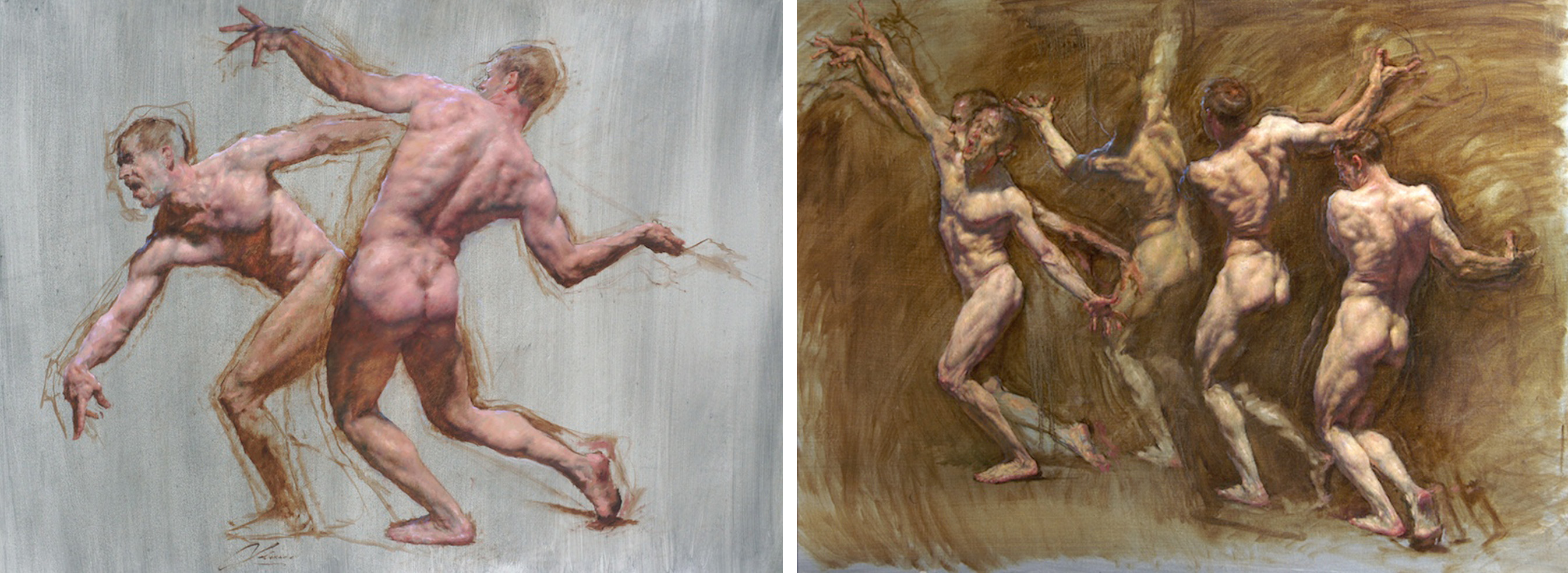 Robert also varies his use of this technique, as sometimes it becomes very subtle so as to unobtrusively add to the sense of motion, as in the image on the left. Other times, he leaves the pentimenti highly visible but “unfinished” in the background to give a sense of time elapsing during a motion, as in the example on the right.