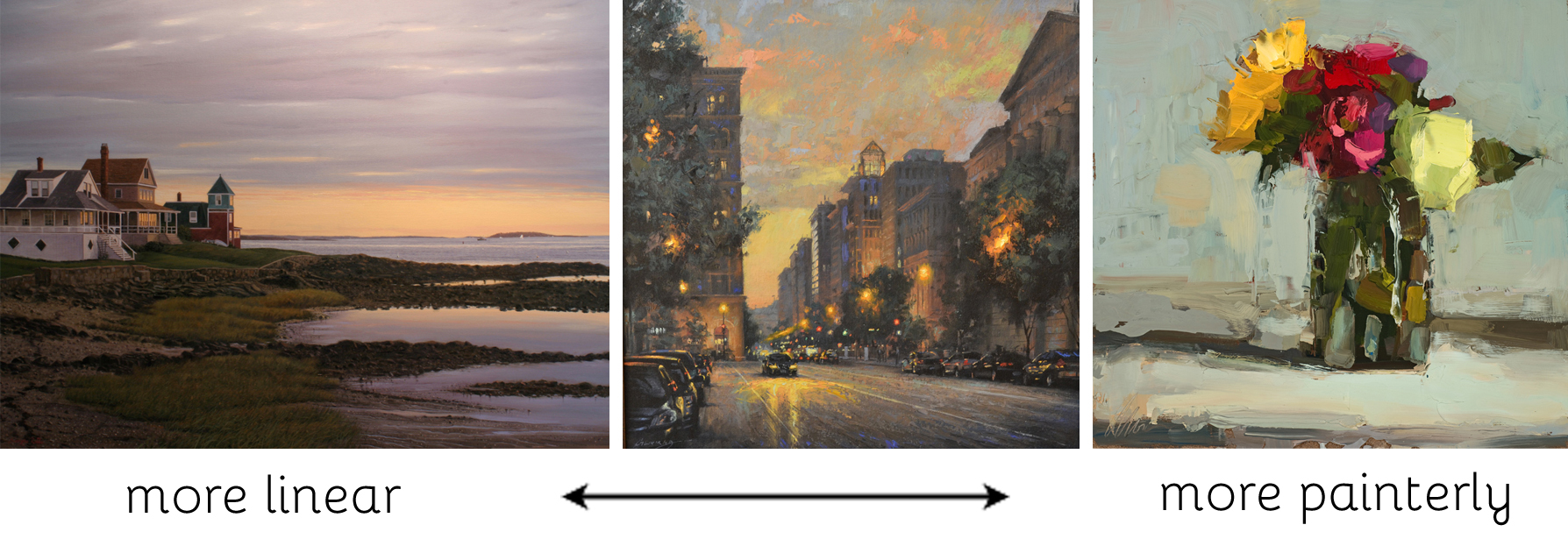 The original Realists were rather straightforward about the way that they painted their subjects: crisp, sharp, and very much as they appeared to the human eye–this is all descriptive of linear painting. As the 18th century advanced, art saw the rise of Impressionism, and therefore a more “painterly” way of painting. Painterliness refers to a style in which artists portray something with less than perfect control. Not all edges must be clean and sharp, not every detail and nuance must be shown. This gentle, looser, and more expressive manner of painting was adopted by many masters of the 19th and 20th century, including Vincent Van Gogh, Pierre-Auguste Renoir, and John Singer Sargent.
