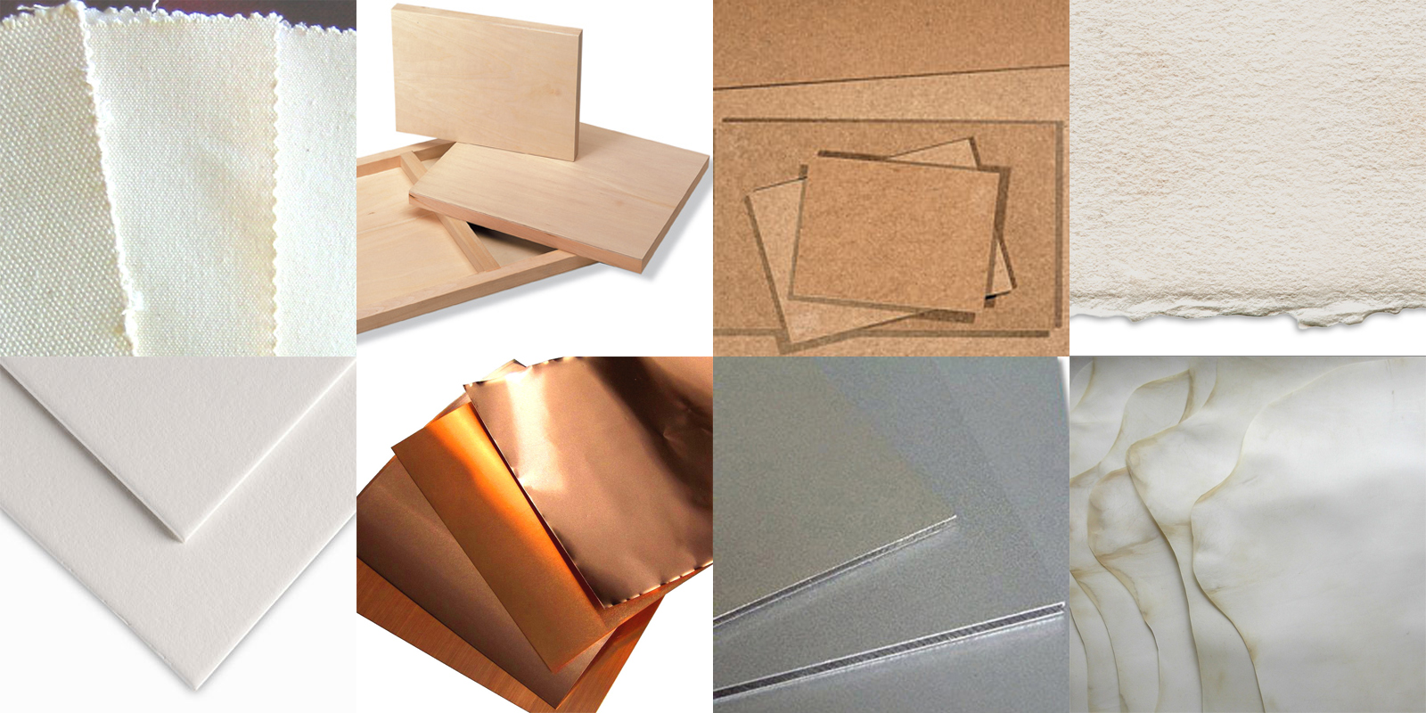 Here we have pictured just a few examples of the many different types of surfaces fine artists use to create their artwork. These are several of the most common–canvas, wood, masonite, paper, copper, aluminum, vellum–but there is truly an astounding variety out there when it comes to different artists’ preferred surfaces. They can all be divided into two basic categories: rigid (wood, panel, metal) and flexible (canvas, paper, vellum) materials.