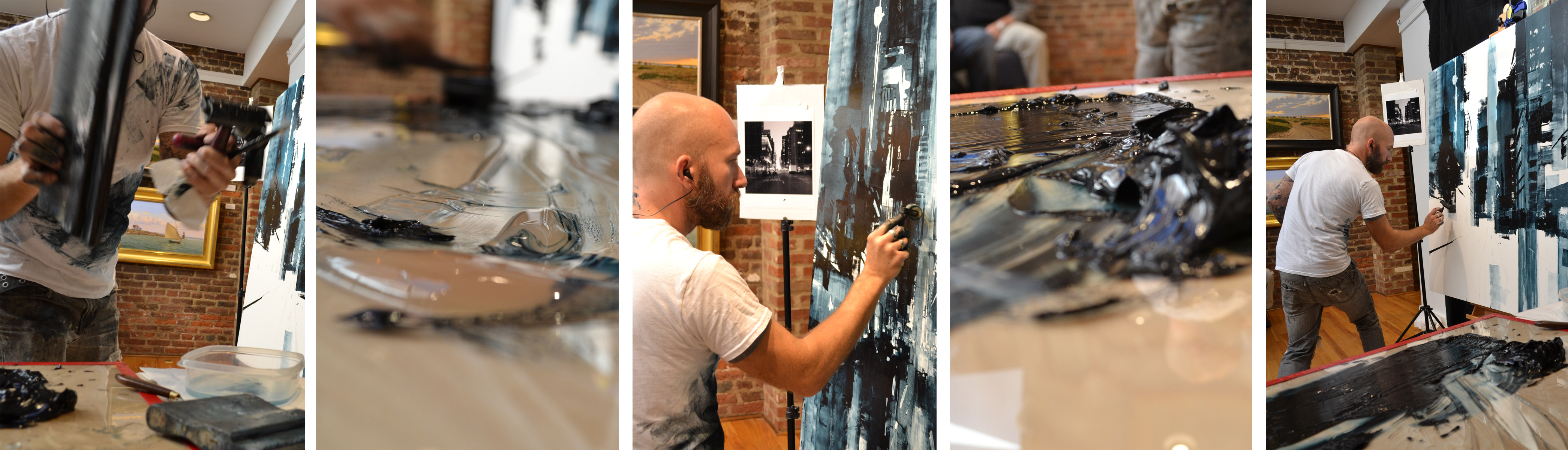 In just about an hour and a half, Jeremy created before our eyes one of his cityscape compositions. These compositions are typically done in just one or two colors (in this case, black paint and some Prussian blue) and, while Jeremy does consider these to be finished works in and of themselves, they are also a glimpse for the rest of us at exactly what the first stage of his more detailed and colorful cityscapes entails. Each time he paints one of these detailed, colorful cityscapes, Jeremy begins by creating the composition. It was such a thrill to watch how he does it!