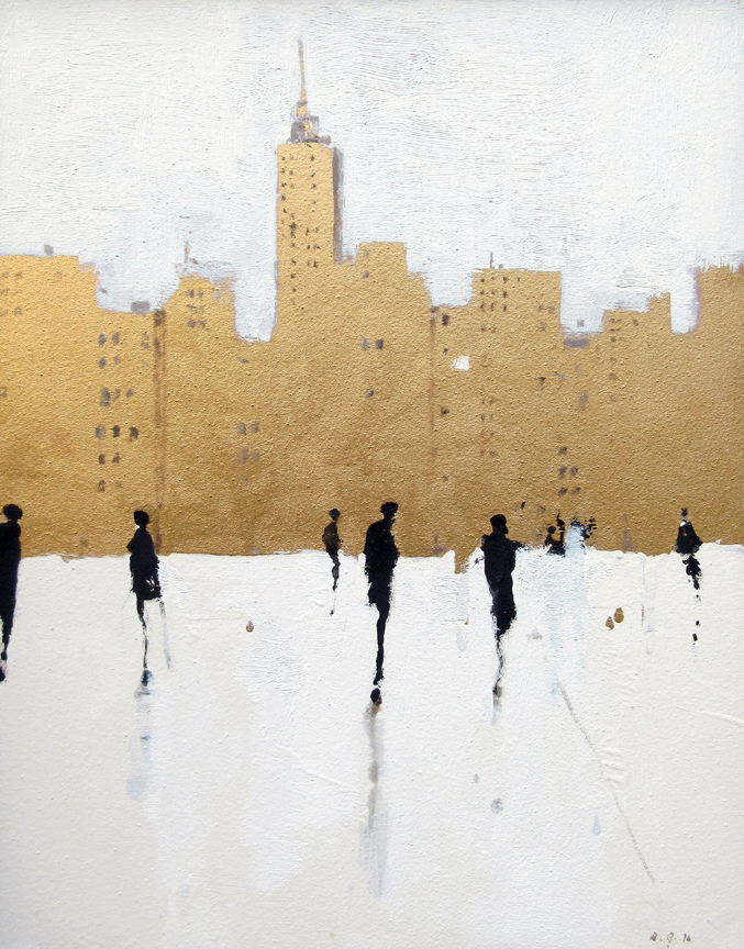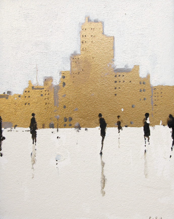 In cases like Geoffrey Johnson‘s paintings where Impressionistic black figures appear before golden cityscapes, there is an establishment of space as well as an increased focus on the figures due to the color juxtaposition. What makes Johnson’s work so interesting – and also successful – is that he redefines warmer and cooler colors. The warm golden colors, as seen in his studies below, remain in the background while black protrudes to the foreground. He accomplishes a familiar cityscape with anonymous individuals by using an atypical technique – the reversal of colors’ roles.