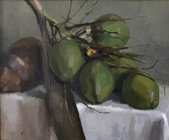 Take a moment and observe the two different ways in which these artists used the paint to describe rounded forms. Louise’s brushstrokes are blended beautifully and give a soft and even slightly blurred appearance to the roundness of the young woman’s face and shoulder, and to the body of the little bird. The colors, values, and brushstrokes are blended seamlessly, one into another, and present a more true-to-life three dimensional effect. Now look at the contrast between that and the roundness of Jussi’s coconuts. Jussi’s brushstrokes are decidedly more defined, and rather than blending seamlessly, the different colors and values present as separate brushstrokes, and visually as separate planes. It creates a fascinating three dimensional effect, that is less strictly realistic and more painterly, and serves to create a glittering effect of light on these forms. It is this unblended, planar approach to describing form with brushstrokes that we’re going to take a look at today.