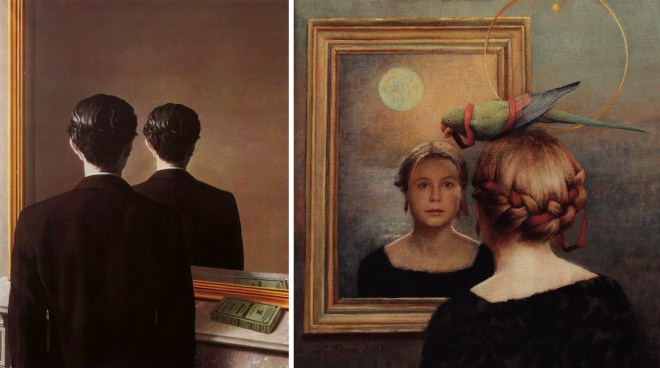 While some Surrealist painters, like Ernst and Dalí, created images that were more fantastical, some, like Rene Magritte, painted oddly familiar, ordinary looking scenes that had a major twist to them, and often an unsettling one. This is one of the aims of Surrealism–to get you to think differently! For instance, we know that a mirror reflects what is in front of it, but what if that reality was twisted a bit? Well, this is a concept that has inspired some Principle Gallery artists, too!