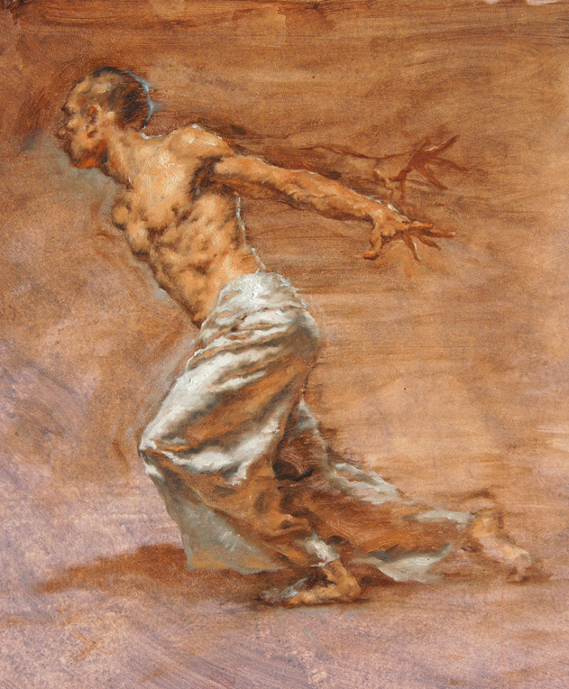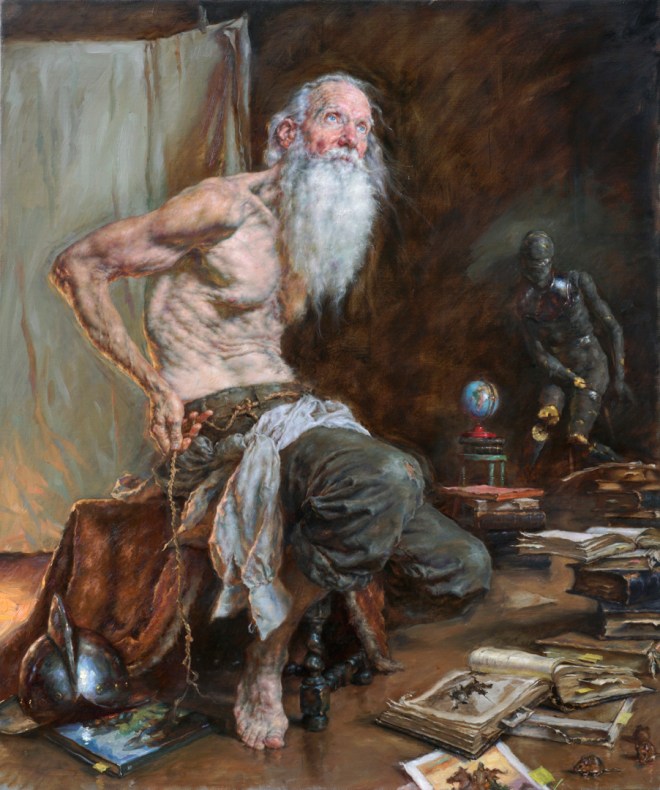 Never before this month, however, has an exhibition here at the gallery been so full of artworks containing allusion! Robert Liberace’s solo exhibition, currently on display, is an amazing collection of paintings and drawings showcasing the artist’s astounding skill at depicting the human form. And, in learning the inspirations and the names of these pieces of artwork, the viewer learns that many of them are mythological and literary allusions! Take, for example, these pieces from Robert’s “Don Quixote” inspired series: