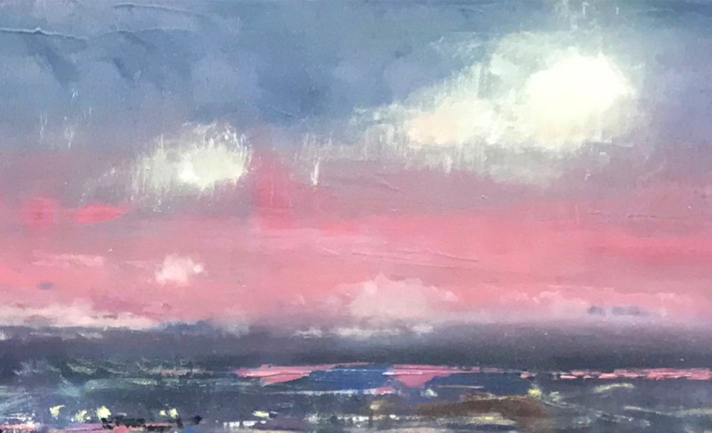 What is “car baking?” There are two things that will significantly speed the drying time of oil paint – heat and UV light. Some Plein Air Easton oil painters will place finished work in a car parked in direct sunlight to speed dry time. “I didn’t want to place the painting in my car, for fear of it being broken into, but, I did place it on my back patio during the day to catch some UV rays,” said Kim.