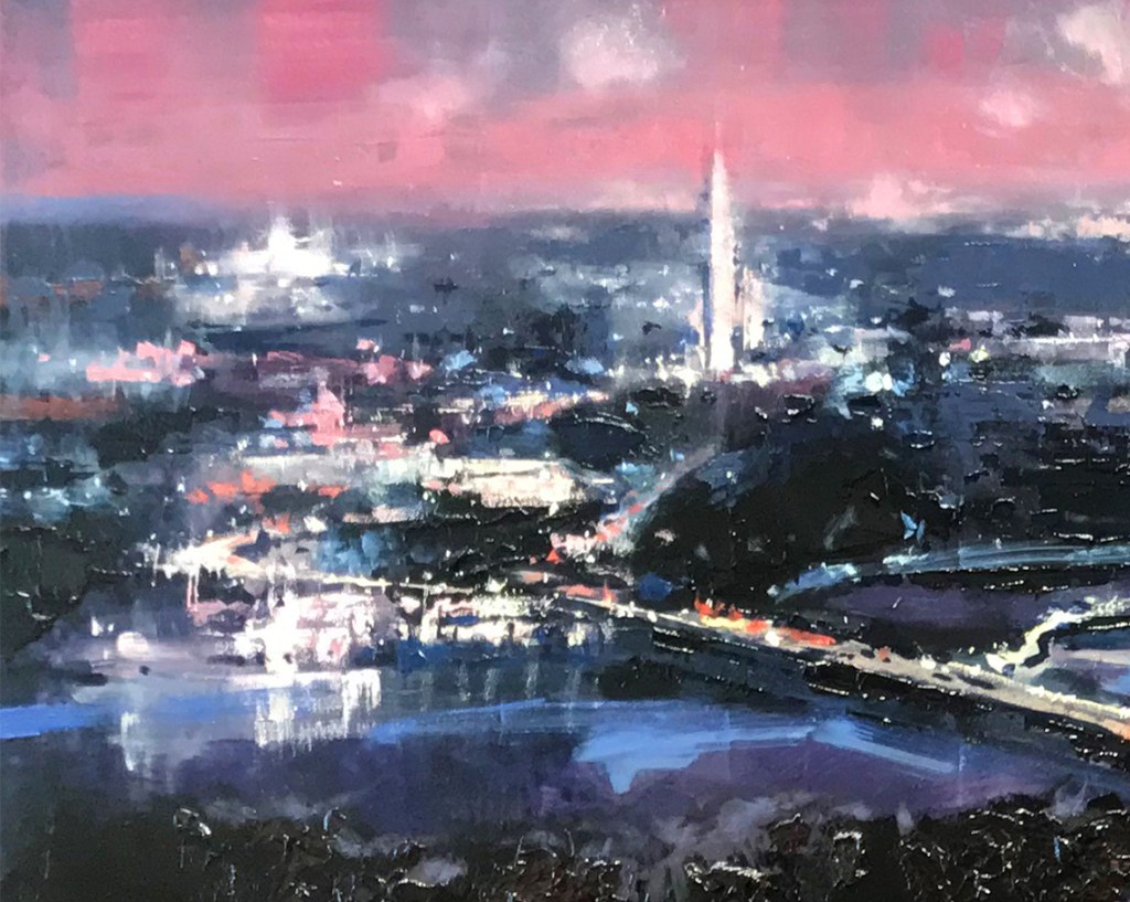 “I started the painting by blocking in the shapes, a strong initial design is very important to me,” said Jill, “Brushes are not the only thing I will use when painting. For this, I employed brushes, palette knives, paper towels for blending as well as a squeegee. I’ll use whatever works in order to get the marks that I’m looking for.”