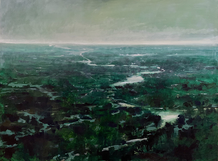 A. I rarely use photo references, and prefer to paint from direct observation or memory/imagination. When I do, I use it as a jumping off point. I can gather some information from the image, regarding shapes and structures and perhaps a bit of relative values (lights and darks) which can be helpful. But I do think photo’s can distort a scene. Color, edges and atmosphere can misinform the viewer. In the “From Above” exhibition, only two or three of my works are from photo references. Those are city scenes, where I needed to describe specific structures. Once drawn in, I can build on the painting with a certain degree of freedom. I don’t want to highly render a scene, so my work will never “look like a photo”! By putting the photo aside after getting the information I need, I find I’m much more able to be expressive with my work, hoping to translate the mood of the scene.