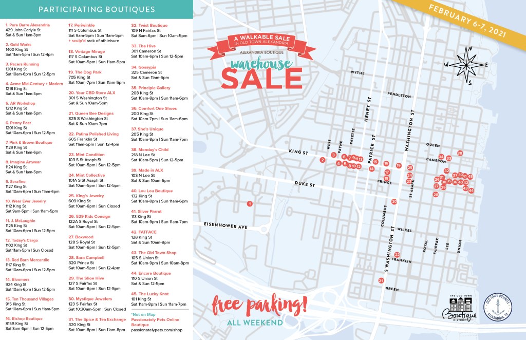 There will be free parking in Old Town all weekend and you can follow the sale on Instagram @alxwarehousesale
