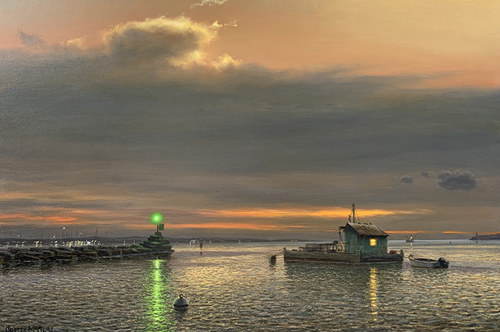 McGurl likes to call himself a “contemporary Luminist” after the 19th-century Luminist painters, “who were influenced by the transcendentalist views of writers like Emerson and Thoreau. Luminism was more of a philosophy than a style,” McGurl explains. “In fact, the word ‘Luminism’ was adopted by 20th-century art historians to describe a group of 19th-century painters that included Fitz Hugh Lane, Martin Johnson Heade, Sanford Gifford, and John R. Kensett.” McGurl points out that while these historic painters opted for a very smooth and quiet paint surface, he himself deploys much more energetic handling and a generally cooler palette. What they share is a fascination with how light is infused into every corner of a landscape, and an intimation that it is a spiritual force.”