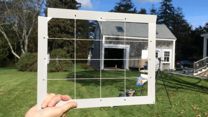 - He then places an open frame of the same size as the painting right next to his canvas. Generally the frame has a wire or string grid dividing up the space.