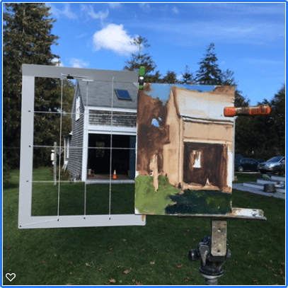 - The artist looks at the subject through the open frame and, by stepping forward and backward, chooses whether to work with a wide angle or a tighter view.