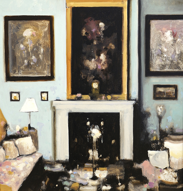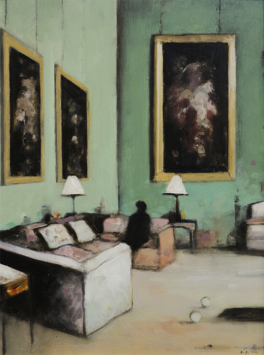 Johnson has also “always been attracted to interiors, work spaces ….. personal spaces,” where he can experiment with brighter colors and the detail and beauty of historic homes. Inspired by a box of sepia toned photographs found in an attic, the artist has created many sepia toned interior scenes, as well ones “where I used quite a bit of color…….it is a nice breakaway, temporarily to get away from the monochromatic palette.”