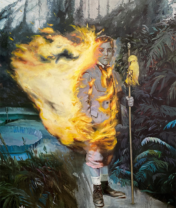 The images sourced from out-of-date materials hold a special fascination. Much like observing the ruins of an old, grand building or a church in a state of decay, the characters and objects that populate his paintings are employed to create a sense of ephemerality, imbuing the work with a kind of fascination and disquiet, over the passage of time. Used in this way they serve as reminders that cutting edge trends and novelty will evolve into new iterations or be abandoned altogether. Using these sources for my paintings allows a certain distance to reinterpret as I see fit. I can see this person or place in a photograph but know nothing about what is going on beyond those paper borders. That ambiguity, between the seen and unseen, between the real and the imaginary, is where my paintings live.