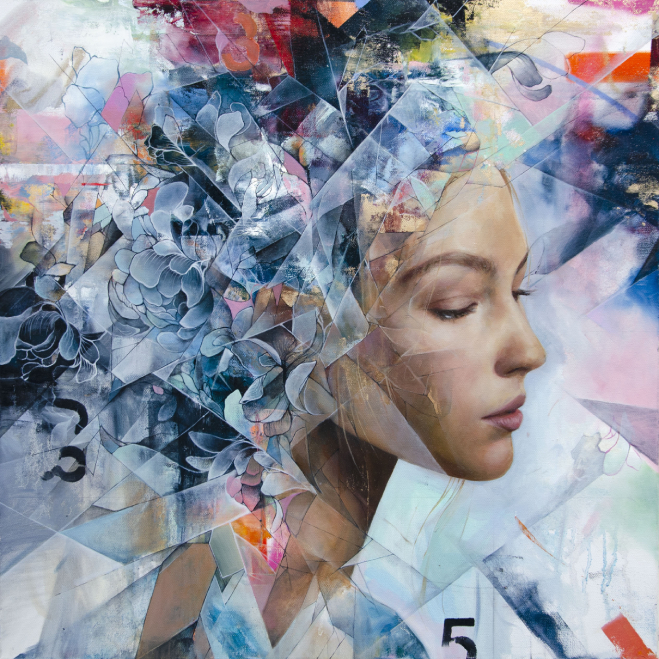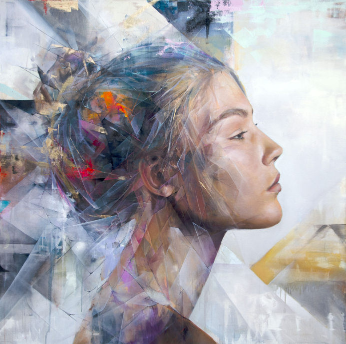 Aiden: I’ve always had an interest in traditional realism, but within my work, I’ve strived to pare it down and reassemble it along a geometric framework that fits within a modern context. For me, the process of painting a portrait or figure involves balancing between reality and abstraction, down to each single feature of the face or hand. I dissect the figure using line work, dividing between tone and texture, and then reconnect the pieces along invisible plans throughout the painting. My goal as an artist is to encapsulate idealized beauty through a cracked or broken lens. I feel as though I have a respect for the pure and beautiful human essence while accepting that it is imperfect, and therefore depict it through fractured line work.