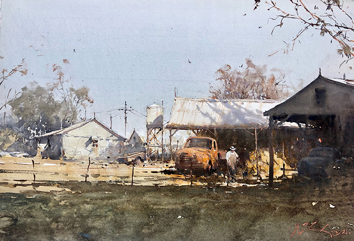 This farm is only an hour or so from my studio and I often go to paint there. It is owned by an old farmer who is in his 90s and has kept every ancient truck and bits of farm machinery, not just from his time, but from his father’s as well! It is like a living farm museum with rusty bits of stuff strewn everywhere. Whenever I get there I find him still works hard and refusing or use what he calls, that newfangled stuff. Of course for me it just makes for a plethora of magic painting subjects. I’ve never come home from there without a good painting. I hope you agree with me with this work as well. This old fashioned lifestyle is sadly fast disappearing, with modern equipment and huge sheds replacing what you see here. I feel it’s almost my duty to keep recording it. Naturally it also takes me back to my childhood days on a farm, so I truly enjoy visiting there and he and I have had many long chats about the good old days. I hope this place keeps living on, at least I hope it will in my paintings.