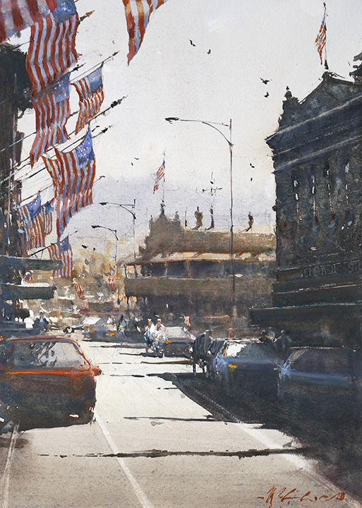 A while back I I visited Denver and ventured out with a group of artists few miles out to a small town of Idaho Springs. I think it was originally a mining town and it actually reminded me of very similar small towns in Australia, with its verandas and architecture. I love small towns, they have a special laid back feel and local characters are great to paint and are always so welcoming. Of course the main subject of this painting are those wonderful American flags fluttering above the street. I am always amazed at the number of flags on display in the States. They seem to be just about everywhere, it is so nice to see. I see everything in visual language terms and these flags change what would otherwise be an average street scene, into a story about history and national pride. It was a hot day and the lack of oxygen high in the Rockies took its toll, but I think it was worth it in the end, I hope you do as well. – Joseph Zbukvic