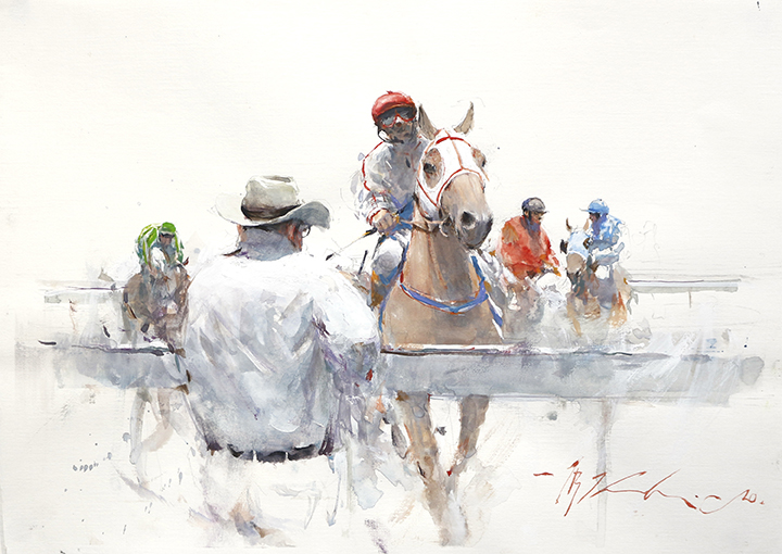 I thought I’d include this study in the exhibition for just a little bit of fun. I am an avid horse racing follower, and apart from placing some bets and having a great time, I also usually sketch while I’m there. The racecourse officials know me well by now and let me into reserved areas . My works also hang in many race clubs collections. This time I was really taken by this trainer’s hat, it reminded me many good times in USA, particularly Texas which is remarkably similar to Australia, with its laid back feel. My love of horses goes back to my childhood when I lived on a small farm with my grandmother. They had a team of working horses used for ploughing and usual farm chores. My job was to bring them water in buckets which I remember weighted a ton! The horses knew me well, and I was the only one allowed to ride them. – Joseph Zbukvic