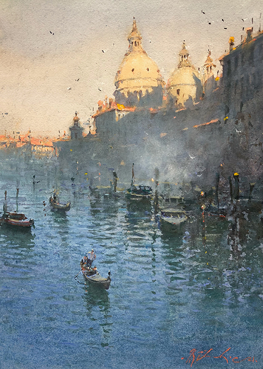 Whenever I paint in Venice it’s unavoidable to feel the burden of history of it having been painted by endless great artists throughout the centuries, this view in particular. The other problem with this subject is it’s actual beauty and familiarity. Most people have seen it on their travels, or at least in photographs or movies. This puts extra pressure on the way to interpret it because it runs the danger of disappointing people‘s own memories and feelings. I have always tended to see it through Whistler’s eyes as a romantic place with intricate lacework or exquisite details. An artist should capture the mood and atmosphere of the subject, and not the subject itself. I am pleased with this twilight memory of what is surely the most romantic city in the world. – Joseph Zbukvic