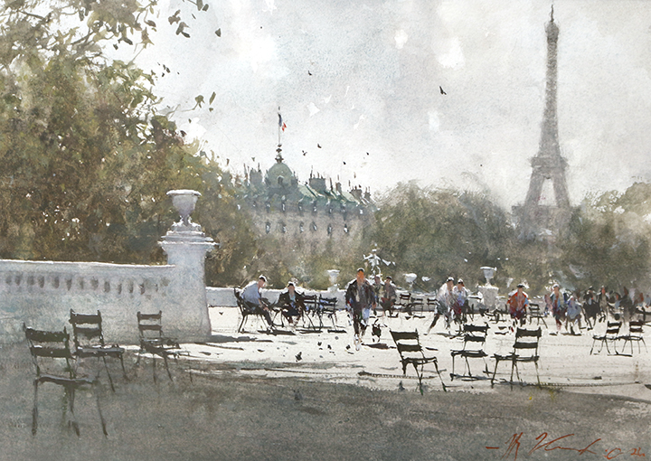 First time I saw these gardens I was astounded by the their spaciousness, but even more so with the care taken to provide individual seating, rather than just park benches to share which we are so used to. This allows individuals to experience it alone or form small groups. The empty chairs also have that inviting feel and somehow seem to hold the presence of previous visitors. Of course I just used one to sit and paint. Each time I’m in Paris I head there because it is not only fabulous to paint in the gardens, but it is also surrounded by endless streets full of paintable subjects. Mind you, so is all of the city really. It’s a Painters paradise. As it happens there is also a wonderful art store just nearby which dates back to 1800s. I have left sizeable proceeds of my sales in it, buying the most wonderful sketchbooks and brushes I don’t need. An artist can never, ever have enough brushes, ever! – Joseph Zbukvic