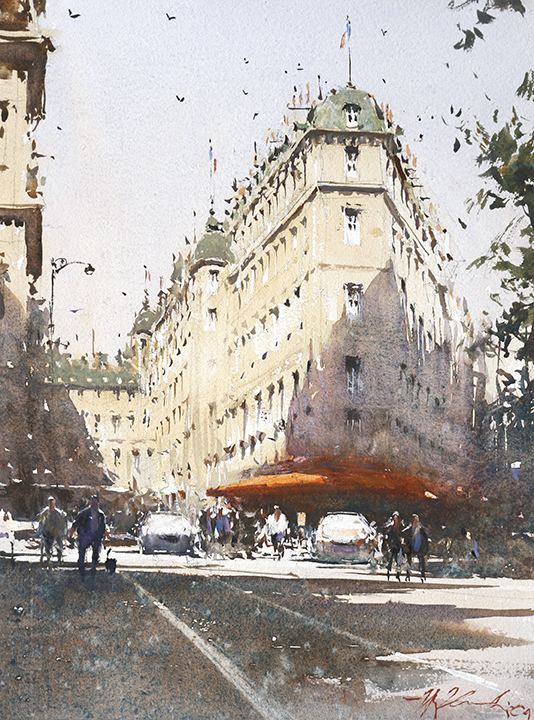 Paris is my favourite city. Not just for the painting subjects, but also for its culture, great food and amazing architecture. It is definitely one of the most beautiful cities in the world with its classic buildings and wonderful boulevards. Everything French people build or make has class and style, and somehow always looks just so right. You would think those red awnings and umbrellas would clash with the uniform grey buildings, but they simply add colour and style, and indeed looks just so Parisienne. You couldn’t imagine that corner without it. When I was done, I simply walked across and had lunch at that restaurant, which was simply delicious, as usual. The owner also provided a free glass of red after he saw the painting. French are incredibly supportive of art, so a lovely morning was had. Well, someone has to do it … – Joseph Zbukvic
