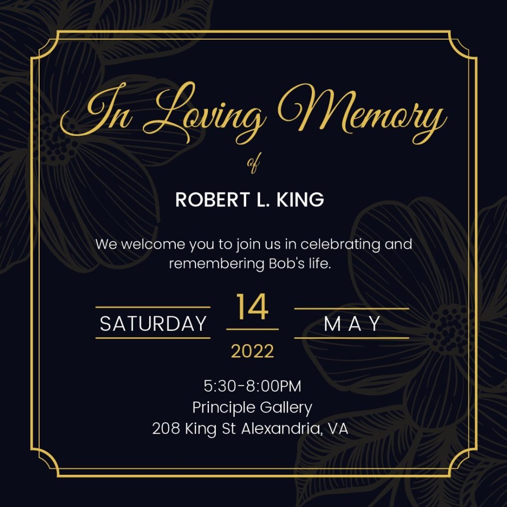 Robert Lee King, a dear friend of Principle Gallery died March 5, 2022. He was an incredibly smart, kind, and strong person and we want to celebrate his legacy. A memorial celebration of Bob’s life will be held on Saturday, May 14th from 5:30-8 pm here in the gallery at 208 King Street Alexandria, VA 22314.
