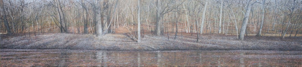 Another element of Gorski’s style is his use of unique and non-traditional painting sizes. He creates a lot of long form landscapes that measure anywhere from 8 inches high and up to 72 inches wide. These paintings provide a rare panoramic look at the fantastical woods of rural Pennsylvania.