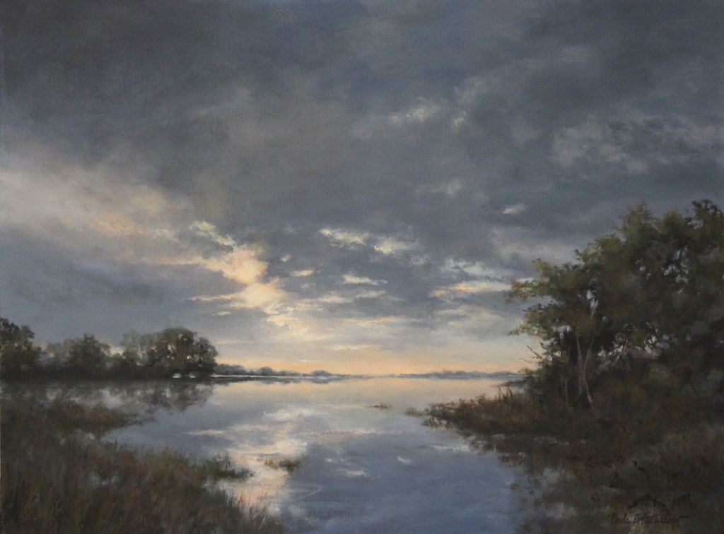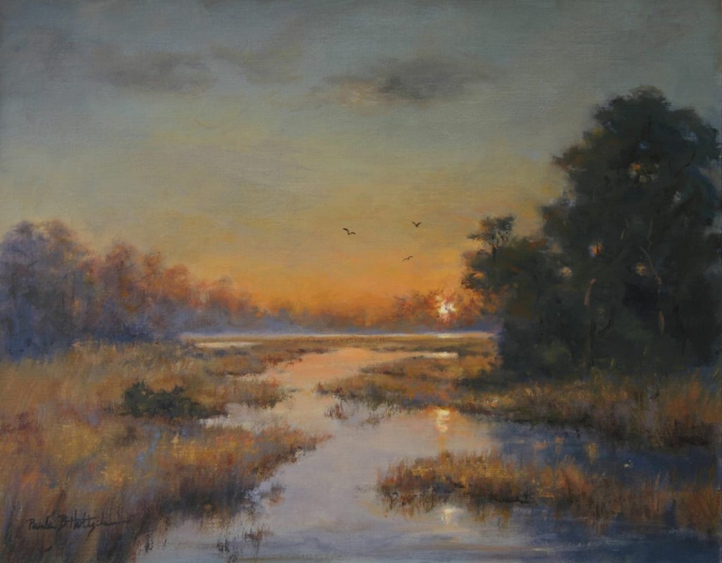 Paula B. Holtzclaw’s beautiful low country landscapes bring the marshes of North Carolina to the walls in Old Town Virginia. We’re so excited to be one of her few east coast galleries we immediately put her painting “Closure” in our window, where it is currently displayed. As expected, it draws in passersby seeking more information! Whether it be an interest in the ability of the artist, the impact of an incredible scene, or recognition of her work.