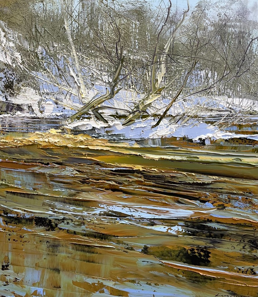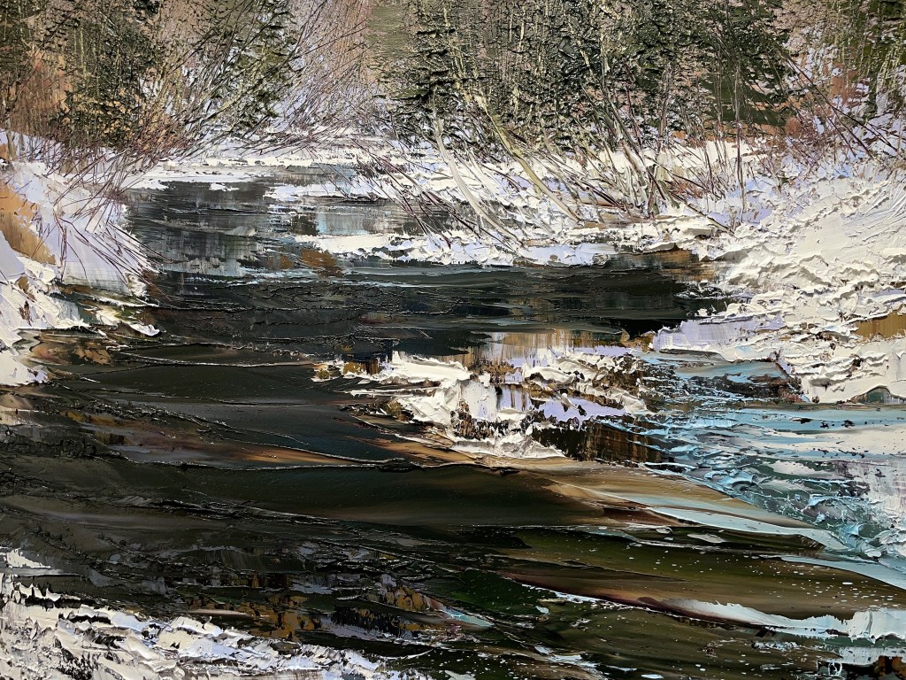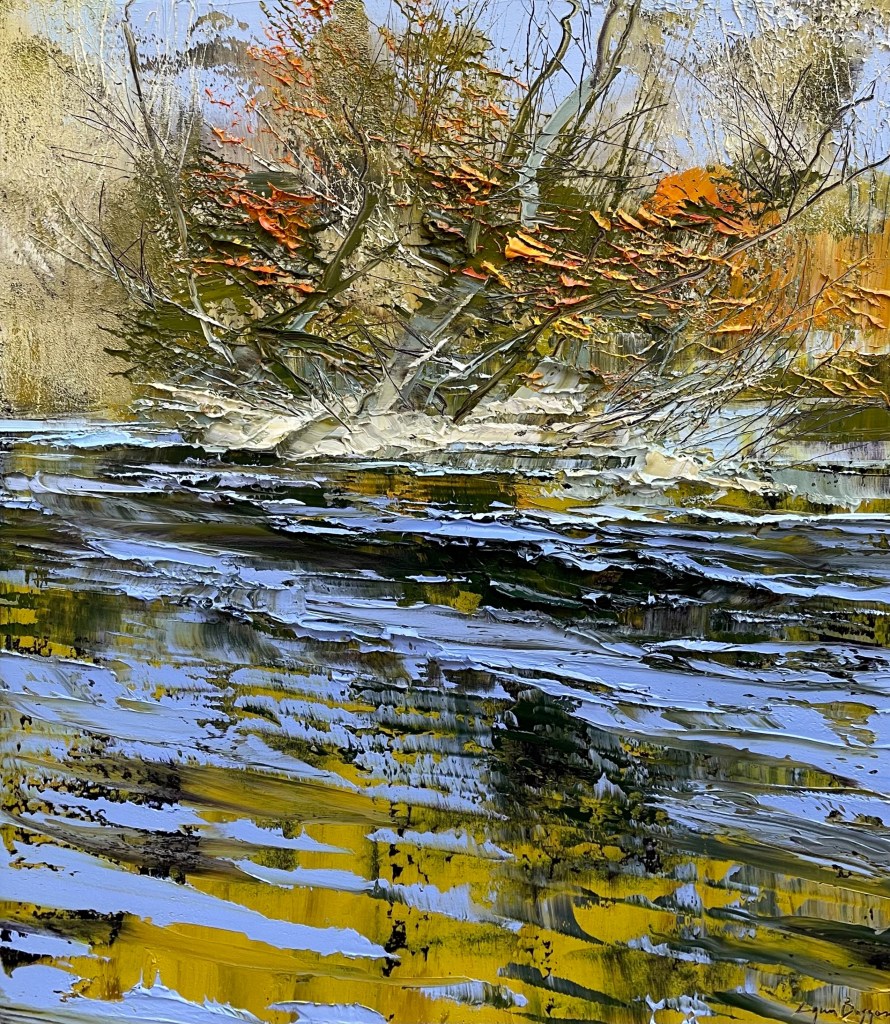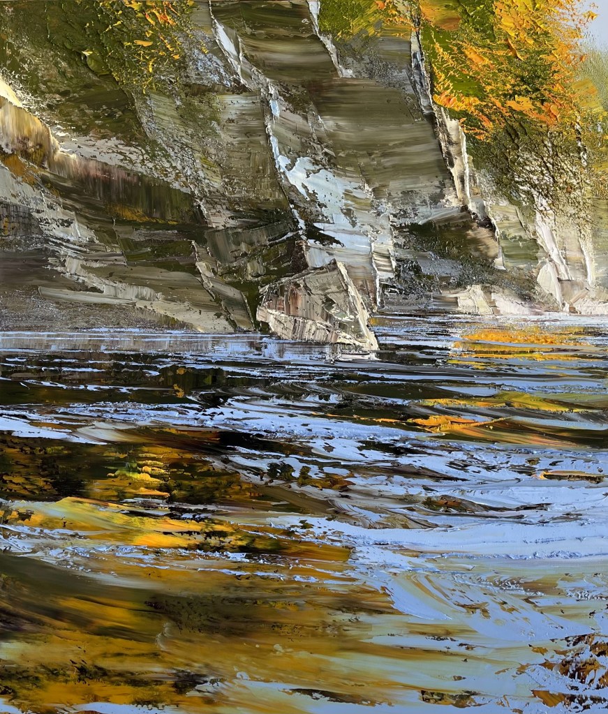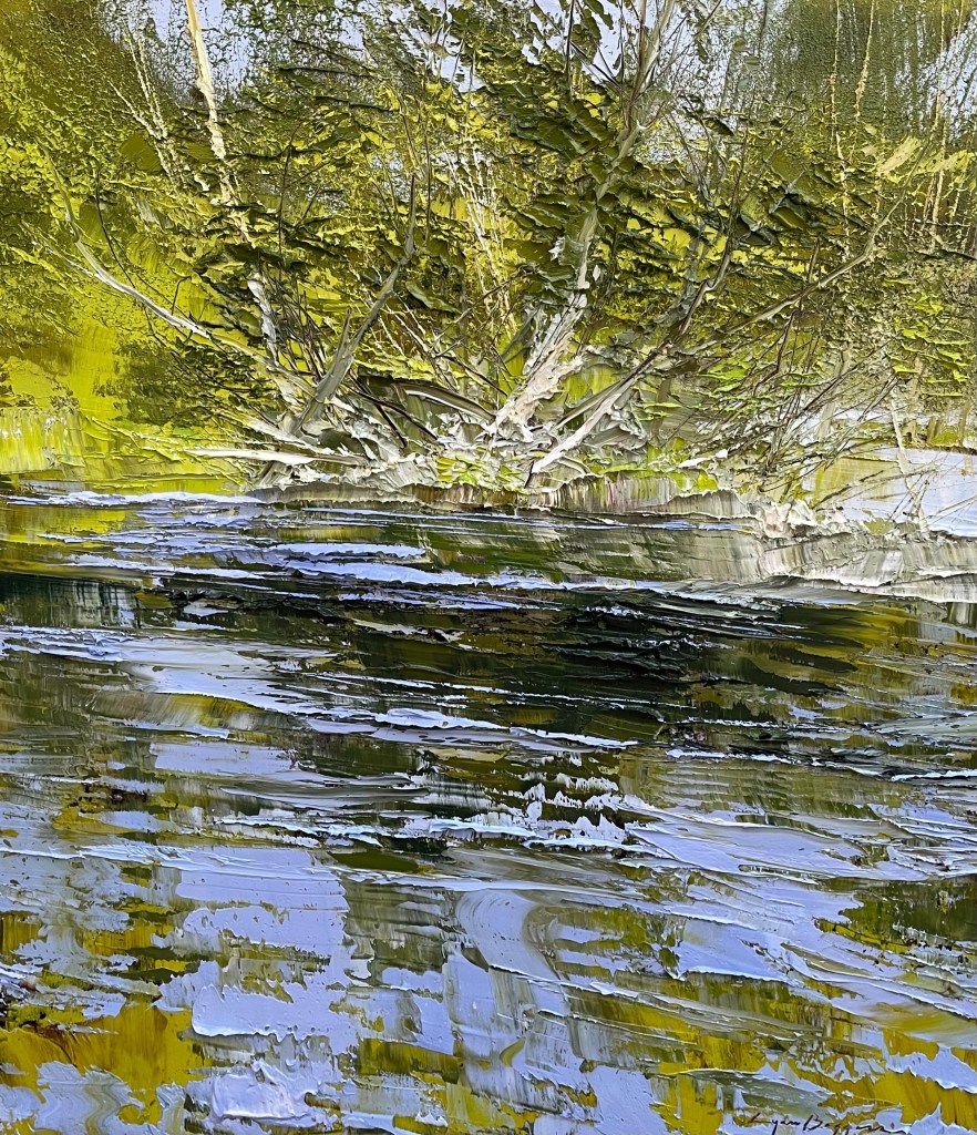Each swipe of the trowel is done with purpose, each mark represents what Lynn sees as he’s painting outside. Whether it’s a rock, a segment of land, branches, water, or sides of cliffs, it’s meticulously placed. In addition to the placement of the elements, the manner in which Lynn makes the marks varies depending on which segment he’s painting. If there are vibrant buds at the end of a tree’s branches, he will mix a gorgeous pigment and apply the paint thick to convey a luscious flower. If there are rocks at the water’s edge, he will apply a thin amount of paint and swipe the trowel in a thin, layered, and jagged technique to suggest the true nature of a rock formation. It’s all about his control and understanding of nature’s beauty as well as its unpredictability.