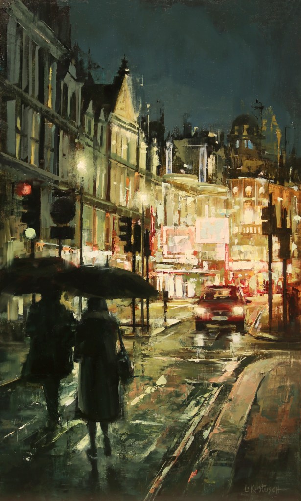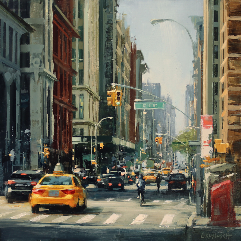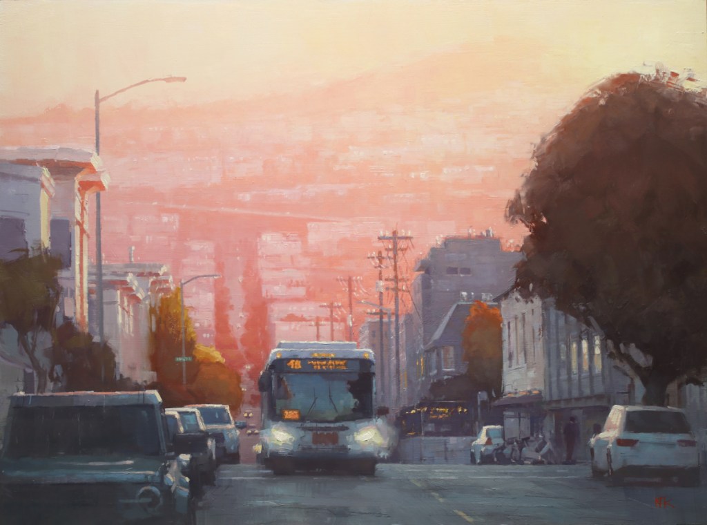 You’ll notice the difference in each one of the artist’s styles as you comb through the exhibition. For example, Nate’s painting Late Afternoon Sun is a snapshot of a quiet moment within the city, while Lindsey’s Evening in the Rain is more active and representative of a stressful commute home in the rain.